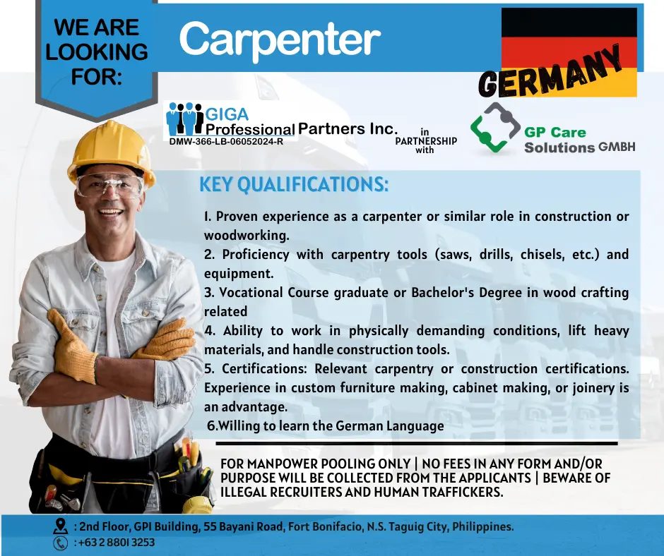 - Vocational training or certification in carpentry is desirable