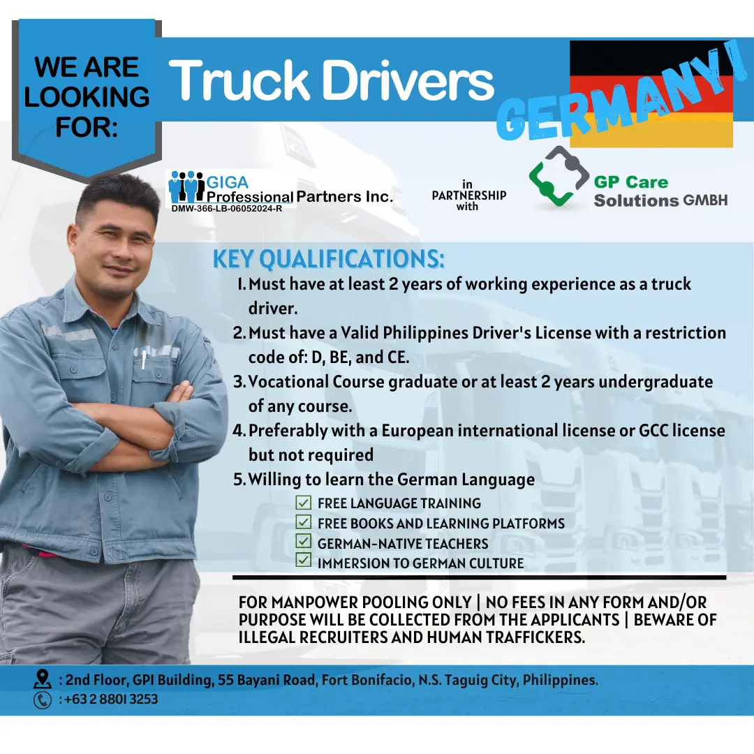 • Must have minimum of 2-3 years of Truck Driving experiences• With a Valid Philippine Driver's License with a Restriction Codes of D, BE and CE• Knows a basic troubleshooting step with trailer trucks• Healthy and Flexible• Ability to work in a team and reliability