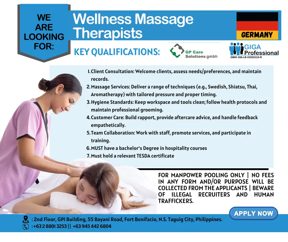 - Holder of a Valid NCII Massage Therapy Certificate (TESDA or Equivalent)
